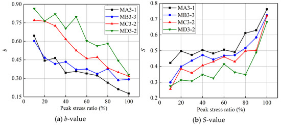 Figure 11 represents that the AE signals gathered during the failure of each sample were classified into 10 stages in terms of the peak stress percent, which were 0~10%, 10~20% and so on. The post-peak and 90~100% were normalized into one stage, and the b-value and S-value were calculated. In addition, with increasing external stress, the b-value exhibited a downward tendency, while the S-value exhibited an upward tendency.