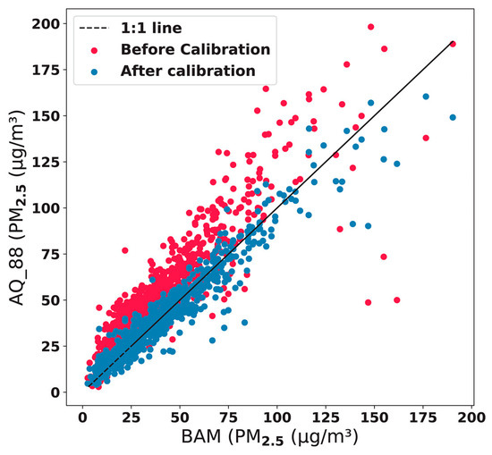 A scatter plot compares reference-grade BAM measurements with those from the low-cost PM sensor (AQ_88) in the test set, illustrating their PM2.5 relationship both before and after calibration with the proposed random forest model [17].