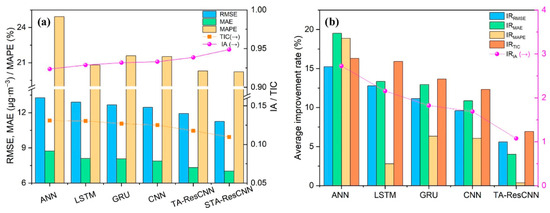 (a) The average PM2.5 prediction performance across three major cities and (b) the average improvement rate achieved by the proposed STA-ResCNN model for PM2.5 prediction. Reprinted from [63].