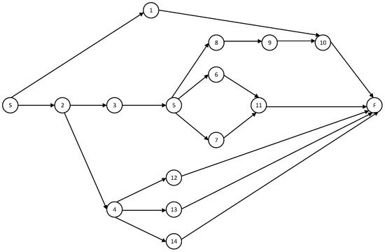 Precedence diagram of PS core layup activities. The numbers inside the nodes (1–14) correspond to the operation numbers listed in Table 2. ‘S’ denotes the dummy start node, representing the beginning of the project without consuming any time or resources, while ‘F’ denotes the dummy finish node, representing the completion of the PS core layup activities.