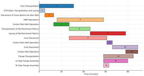 The precedence relationships used for scheduling operations and assigning workforce within the resource-constrained project scheduling framework were guided by the identification of parallelizable tasks through the SMED approach. Operations were classified as either internal or external. Internal tasks are performed within the mold and directly delay subsequent in-mold operations. In contrast, external tasks take place on the mold’s surface or in the blade’s root section and do not interfere with internal activities. These external operations can be carried out in parallel with internal ones, and this potential for concurrency was explicitly incorporated into the formulation of precedence constraints.
