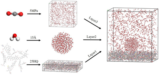 Wettability testing of coal is typically performed on flat coal surfaces; thus, prior to simulating water wettability, it is necessary to construct slab models of coal macromolecules. Simultaneously, a spherical water droplet model must be generated to form the coal–water system. The procedures for constructing the coal slab model and coal–water system, along with parameter settings and model optimization in Materials Studio (MS) 9.0 software, are detailed in reference [30]. The spherical water droplet was constructed with a density of 1 g/cm3, composed of 500 water molecules and a radius of 15 Å. For consistency across simulations, the size of each coal slab model was fixed at 90 × 65 Å, with a thickness of 17 Å—sufficient to ensure full spreading of the droplet and satisfy the wettability simulation requirements. The fixed dimensions were chosen based on fundamental physical constraints and computational best practices documented in the coal-wettability literature [22,24,30,31].
