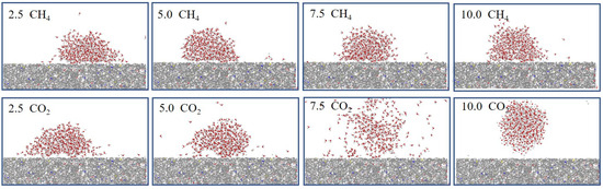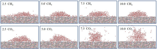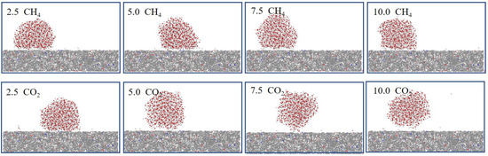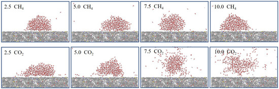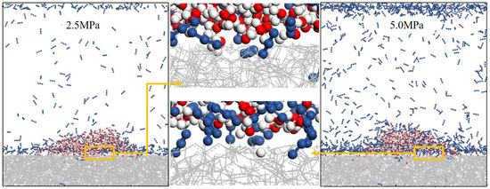 Simulation results under varying pressure conditions indicate that contact angles in pressurized gas environments are higher than the original (baseline) values, suggesting that increased pressure reduces coal surface wettability. Similar findings were reported by Si Binbin et al. [32], who used a molecular model of anthracite and observed through molecular simulations that coal wettability progressively weakens with increasing gas pressure. Yue Jiwei et al. [33] developed an experimental setup to measure coal–water contact angles under CH4 atmospheres and found that the contact angle increased with pressure. These conclusions are consistent with the results of this study. As pressure increases, gas density correspondingly rises, leading to enhanced gas adsorption on the coal surface due to competitive adsorption effects. A dense layer of gas molecules forms on the coal surface, occupying adsorption sites that would otherwise be available to water molecules. As a result, the contact angle increases and the coal becomes less wettable (Figure 10).