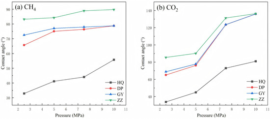 Changes in contact angles under different gas pressure conditions. (a) CH4 gas pressure; (b) CO2 gas pressure.