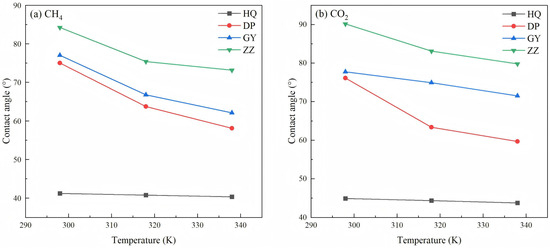 Changes in contact angles under different gas temperature conditions. (a) CH4 gas pressure; (b) CO2 gas pressure.