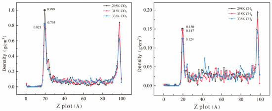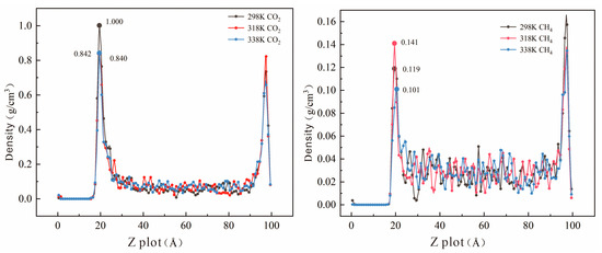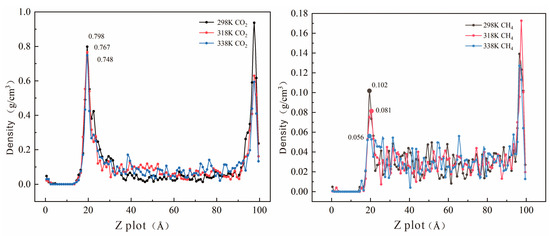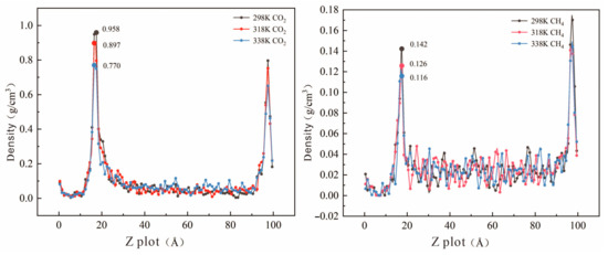Simulation results under different temperature conditions reveal that, regardless of whether the environment is CO2 or CH4, the contact angle decreases with increasing temperature. This trend can be attributed to the enhanced kinetic energy of water molecules at higher temperatures, which facilitates faster diffusion and distribution across the coal surface. Simultaneously, the increased kinetic energy of gas molecules raises their probability of desorption, leading to a reduction in the amount of CO2 and CH4 adsorbed on the coal surface. As a result, more adsorption sites become available for water molecules, allowing them to approach the coal surface more easily and form hydrogen bonds. The increased number of hydrogen bonds promotes better wetting, resulting in smaller contact angles and improved coal wettability. To further explore the molecular mechanism behind this phenomenon, density profiles of CO2 and CH4 molecules along the Z-axis were analyzed for different coal ranks at various temperatures under a fixed pressure of 5 MPa (Figure 11, Figure 12, Figure 13 and Figure 14). These analyses provide molecular-level insights into how temperature influences wettability differences across coal ranks.