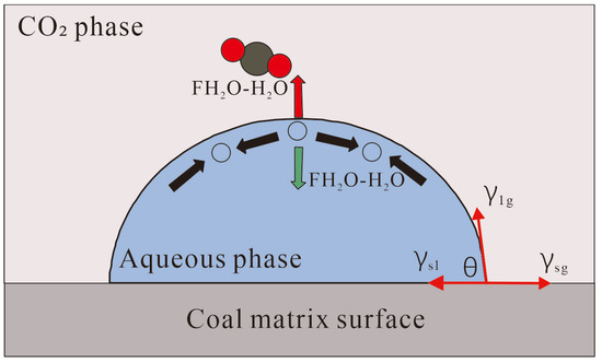 For the intermolecular forces between H2O and CO2 on the coal matrix surface, as shown in Figure 15, when the pressure is constant (5 MPa), the increase in temperature leads to an increase in the distance between molecules. Therefore, the attraction between the outermost molecules on the water droplet surface and other molecules decreases; that is, FH2O-H2O becomes smaller, and the surface tension of water decreases. Similarly, the increase in temperature also causes a decrease in the interaction force between CO2 and H2O (FCO2-H2O), leading to a decrease in the surface tension of H2O-CO2. Due to the decrease in the surface tension of water, the force that maintains the liquid droplet shape becomes weaker, the water molecules disperse, which leads to a decrease in the wetting angle and an improvement in wettability.