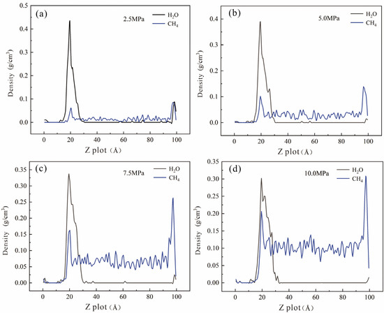 Molecular density curves at different CH4 gas pressures. (a) 2.5 MPa; (b) 5.0 MPa; (c) 7.5 MPa; (d) 10.0 MPa.
