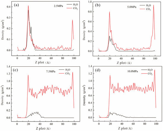 Molecular density curves at different CO2 gas pressures. (a) 2.5 MPa; (b) 5.0 MPa; (c) 7.5 MPa; (d) 10.0 MPa.