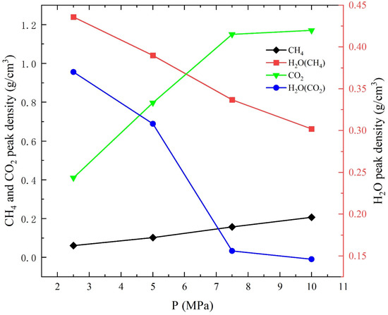 To further investigate the molecular mechanism underlying these differences, the HQ coal system was used to analyze the density distributions of CH4-H2O and CO2-H2O under pressures of 2.5, 5.0, 7.5, and 10.0 MPa at 298 K (Figure 16 and Figure 17). The corresponding peak density values for each gas–water pair at different pressures are summarized in Table 8. These analyses provide molecular-level insights into how the nature of the injected gas influences coal wettability.
