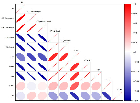 To investigate the differences in wettability among coal ranks, the contact angle, number of hydrogen bonds, and the abundance of oxygen-containing functional groups for each coal macromolecular model were quantified under conditions of 5 MPa and 298 K (Table 9). Subsequently, Pearson correlation analysis was performed using Origin software v8.5 to evaluate the relationships among these parameters. The resulting correlation heatmaps for coal wettability under different gas environments are shown in Figure 19.
