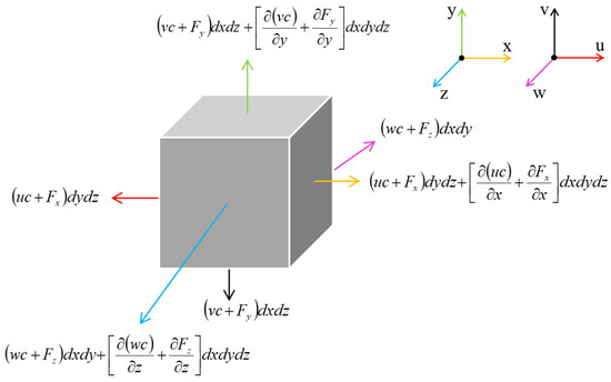 The tracer gas transport mechanism adheres to fundamental physical principles, including the law of mass conservation, the Fick law of diffusion, and the Boussinesq hypothesis for turbulent closure [46,48]. By defining a differential control volume in the tracer-laden airflow (Figure 1) and analyzing the relationships among instantaneous, fluctuating, and time-averaged tracer quantities under these principles, the governing equations are derived to characterize the temporal evolution of tracer concentration.