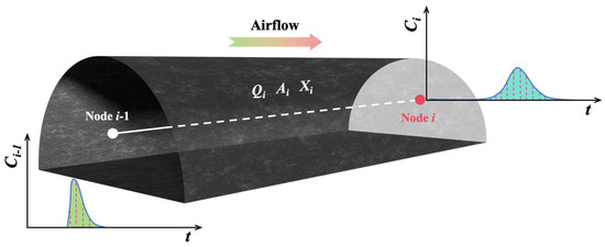 The tracer gas experiments were conducted across multiple interconnected airways at an underground coal mine, with concentration measurements spanning these continuous passageways. Consequently, the single-airway concentration solution (Equation (13)) becomes insufficient for predicting results in such complex configurations. Figure 2 illustrates the tracer concentration distribution between two adjacent nodes.