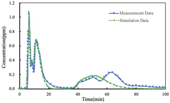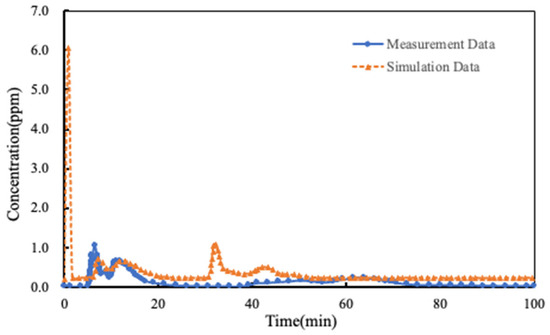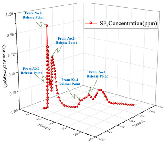 Given the staggered release timings across five designated locations, the Bruel & Kiaer 1302 detector initiated continuous monitoring immediately following the first release event (Point 5). Table 2 summarizes the acquired monitoring dataset, correlating temporal concentration profiles with ventilation pathway dynamics.