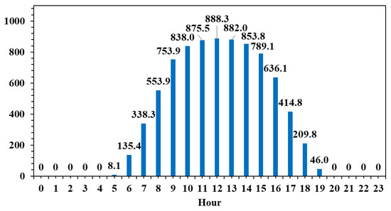 The modeling dataset considered for this research is described in Table 1. The selected time frame starts on 1 September 2023 and ends on 31 August 2024. All the variables are aggregated on an hourly basis. Over the entire dataset, pv is the only variable where a few data points are missing. The missing data points are extrapolated during the data preprocessing using polynomial interpolation. Other features that might improve the model’s performance are created from the timestamp. The new variables are hour, day of the month, and month. These three variables will help understand the patterns related to the day–night cycle and the summer–winter cycle, since solar energy production is known to be higher around noon on summer days and lower at all other times. As expected, when the solar irradiance measurement is visualized as an average by hour for the entire dataset, it can be observed that the peak value is at noon after increasing throughout the morning, then later in the day, it decreases to zero at night (Figure 1).