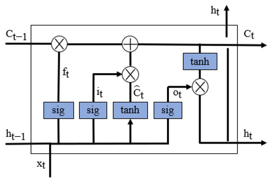 The cell state at the current time step, , is calculated based on the information that is discarded from the previous time step cell state and on the input information acquired at the current time step (Equation (4)):