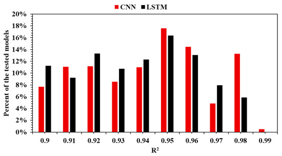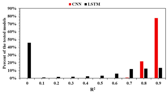 LSTM and CNN architectures are designed for applications involving time series. Both performed very well for the use case proposed in this research (Figure 5). A total of 77% of the CNN models that were trained and later tested had an R2 equal to or higher than 0.9, showing how powerful this architecture is for a wide range of hyperparameters. In the case of LSTM, 13% of the models had an R2 equal to or higher than 0.9. This means that there are fewer models with such high performance, so the number of combinations of optimal hyperparameters is significantly less compared to a CNN. This section, divided by subheadings, provides a concise description of the experimental results, their interpretation, and the experimental conclusions that can be drawn.