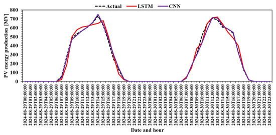 Figure 8 provides a critical comparison between the actual PV production and the predictions made by LSTM and CNN models during the testing phase. The dashed line represents the ground truth data, while the solid red and purple lines represent the LSTM and CNN predictions, respectively.