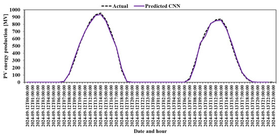 To simulate a real-world scenario, Figure 9 plots the actual PV production against the CNN prediction for a two-day timeframe, 12 September 2024 and 13 September 2024, that was not part of the initial dataset. This confirms the model’s generalization capabilities.