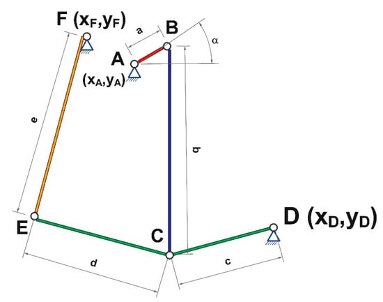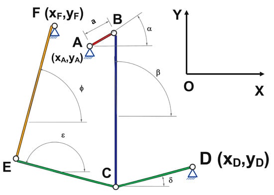 Since the mechanism under study includes three fixed joints (joints A, D, and F), their coordinates were denoted as follows: