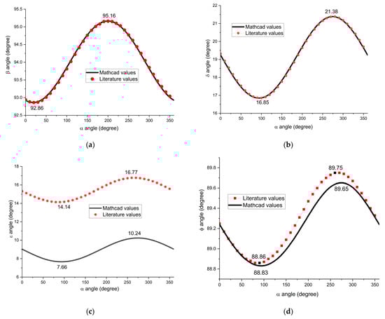 - Concerning the variation in angle ϕ, it is noted that for the crank angle intervals 0–55° and 325–360°, there are no differences between the mathematically obtained values and those reported in the literature. Outside these intervals, a maximum deviation of 0.14° is observed between the two data sets. Additionally, angle ϕ varies within a very narrow range, from 88.8° to 89.65°, indicating a limited oscillation, which is a result of the constrained motion within the mechanism.