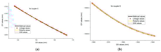 - Regarding the trajectory of the E pair, it is observed that all four curves follow a similar path, indicating good agreement between the applied methods. A minor discrepancy of 0.013 mm is noted between the values obtained using Mathcad, Linkage, and Roberts Animator, compared to those obtained via GIM software. This variation may be attributed to the interpolation algorithms employed by the respective programs.