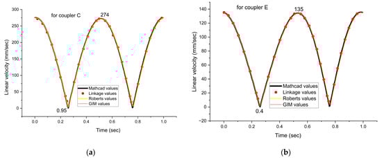 5. The article also includes an analysis of the linear velocity variation corresponding to the C and E kinematic pairs. Both velocity profiles exhibit sinusoidal variation, with peak values of approximately 274 mm/s for pair C and 135 mm/s for pair E. The velocity reaches a minimum every 0.5 s, confirming the cyclic nature of the mechanism’s motion.