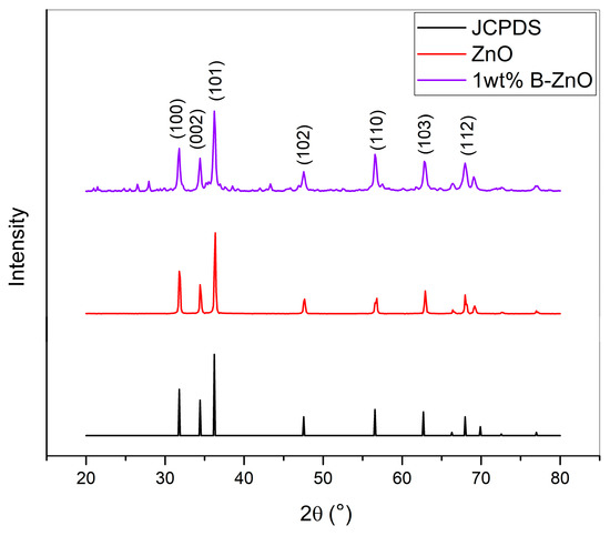 XRD patterns of pure ZnO and 1 wt% B-doped ZnO nanostructures alongside the standard JCPDS reference pattern.
