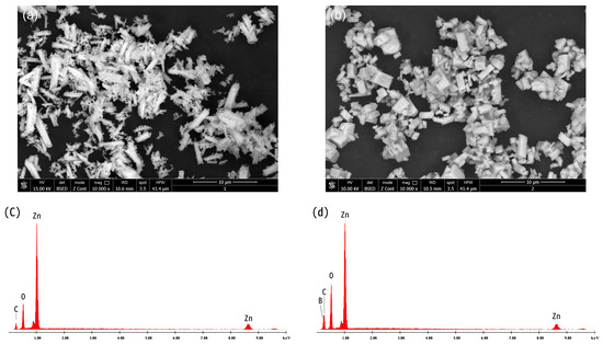 SEM images of samples synthesized at 700 °C: (a) ZnO NP; (b) 1 wt% B-ZnO NP; EDX spectra of synthesized samples: (c) ZnO NP; (d) 1 wt% B-ZnO NP.