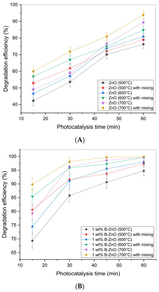 It is apparent that the photocatalytic efficiency for the undoped and boron-doped ZnO increases with the calcination temperature and the duration of the photocatalysis. Specifically, ZnO samples calcined at 500 °C exhibit a lower degradation efficiency compared to those calcined at higher temperatures of 600 °C and 700 °C (Figure 3A). Considering the light source in the experiments being near visible in terms of wavelength, it has been previously established that the bandgap value of nanomaterials used would determine their photocatalytic activity. The experiments that were conducted without mixing in the dark resulted in lower efficiency compared to experiments with samples treated at lower temperatures and a step that includes mixing in the dark. This is related to adsorption equilibrium achieved by this step, prior to the UV-A exposure [69].