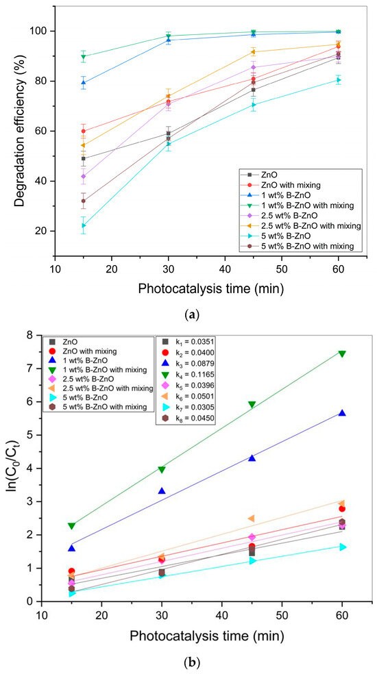 (a) Impact of increased boron doping on photocatalytic efficiency of ZnO nanoparticles calcined at 700 °C; (b) kinetic analysis of photocatalytic degradation using undoped and boron-doped ZnO nanoparticles calcined at 700 °C.