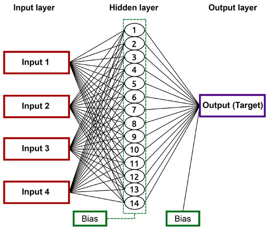 Each network is composed of artificial neurons organized into layers, interconnected in parallel. The strength of these connections is defined by their weights. In every ANN, the initial layer is the input layer (independent variables), and the final layer is the output layer (dependent variables). Between these, there can be one or more hidden layers, functioning as feature detectors. Although multiple hidden layers are possible, the universal approximation theory suggests that a single hidden layer with enough neurons can model any input–output relationship. The number of neurons in the hidden layer, which influences the accuracy of neural predictions, is a key design parameter. In a feed-forward neural net, each neuron in a layer connects to every neuron in the adjacent layer [90,91]. The input layer is a distributor, directly relaying input to the hidden layer. Figure 5 shows an FFNN with one input layer containing four input neurons (parameters), one hidden layer with 14 neurons, and one output layer with a single neuron.