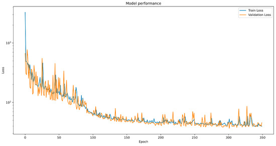 In Figure 6, the mean squared error (loss) for both sets (“train” and “validation”) decreases relatively quickly through the epochs, which is typical when the model begins to learn from the data. The reduction in MSE for training indicates that the model is increasingly fitting the training data better. However, the trend of decreasing MSE for the test and validation datasets stabilizes and does not significantly decrease after the initial drop. The fact that the MSE for validation and testing are close to each other and relatively stable suggests that the model’s performance has stabilized and that the model generalizes well to new data. The absence of overfitting, which can occur due to the smaller volume of data used for training, as well as the stability of the mean squared error values, can be considered an indication of the model’s suitability in terms of generalizability and stability [104,105].
