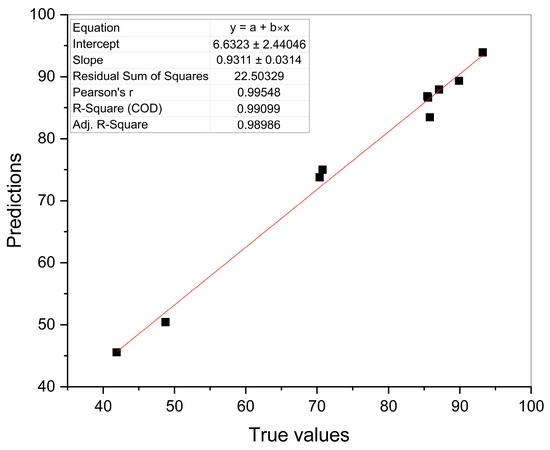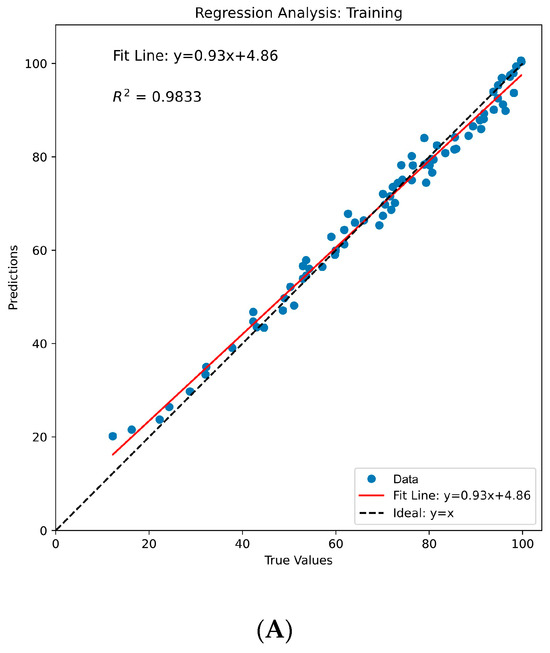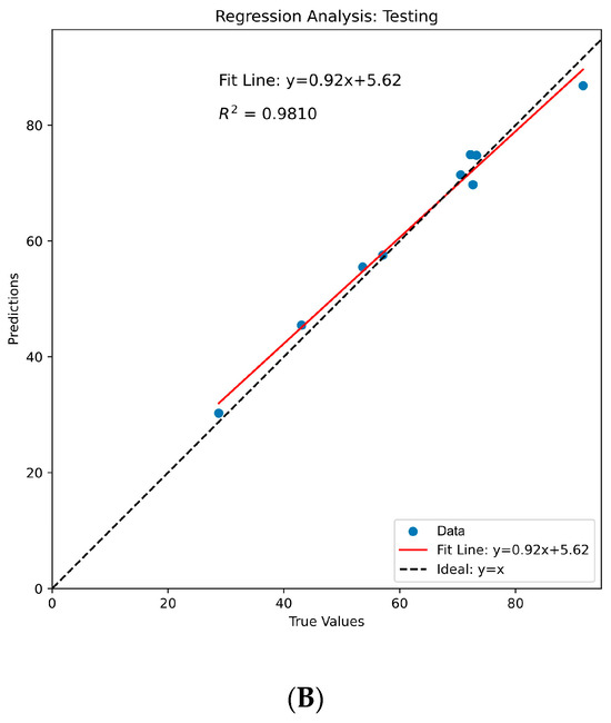 Based on the provided charts, several conclusions about the regression analysis that was performed for two datasets, training and testing, can be drawn. On the chart for the training set shown in Figure 7A, the best-fit line has the equation y = 0.93x + 4.86, which indicates that the predictions are very close to the true values but with a slight underestimation since the slope coefficient is less than 1. The ideal line, representing a perfect match between predictions and true values, is y = x and is shown with a dashed line. For the test set shown in Figure 7B, the best-fit line has the equation y = 0.92x + 5.62, indicating that the model provides relatively high prediction values compared to the actual ones, given that the coefficient is greater than 1. The coefficient value of 0.9810 for the test set shows that the model explains the variability of the actual values very well, which is an indicator of a good model fit [106]. Overall, the model seems quite reliable in predicting data, although there is a certain difference between the training and test sets that could be further explored for model optimization.