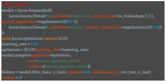 The model employs the stochastic gradient descent (SGD) optimizer, a robust and straightforward method for iterative learning. The learning rate is a crucial hyperparameter in training neural networks, determining the step size at each iteration while moving toward a minimum loss function [101]. Here, it is set to 0.05, offering a balance between the speed of convergence and the risk of overshooting minimal points. During the compilation phase, the model is configured with the previously defined SGD optimizer. The loss function used is ‘mean squared error’, which is standard for regression models as it measures the average of the squares of the errors—that is, the average squared difference between the estimated values and the actual value. Additionally, ‘mean absolute error’ is tracked as a metric to provide a clear measure of model performance during the training and validation phases [102,103].