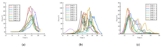 Shear stress–time plot: (a) Diced chicken. (b) Peanuts. (c) Diced scallions.