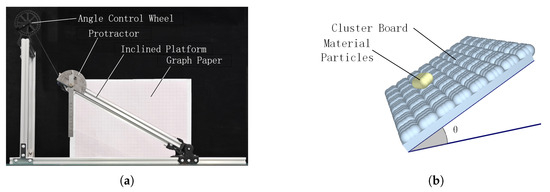 Static friction coefficient test platform and inclined plane simulation: (a) Inclined plane experimental setup. (b) DEM simulation model.