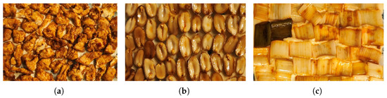 where S is the shear modulus (MPa), E is the elastic modulus (MPa), and P is the Poisson’s ratio. P was taken as 0.450 for diced chicken, 0.362 for peanuts, and 0.360 for diced scallions. Based on this, the calculated elastic moduli were 3.45 MPa for diced chicken, 36.42 MPa for peanuts, and 21.43 MPa for diced scallions.