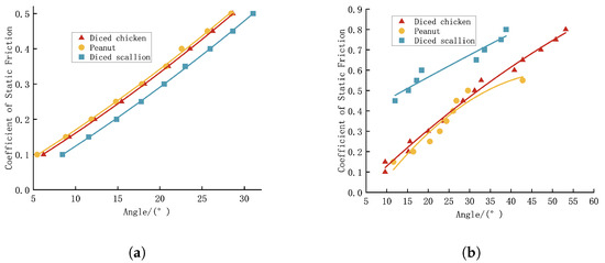 In the EDEM simulation experiments, the following fitted equations for diced chicken, peanuts, and diced scallions were, respectively, obtained with the corresponding fitting curves displayed in Figure 6b: