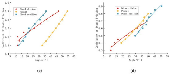 In the EDEM simulation experiments, the following fitted equations for diced chicken, peanuts, and diced scallions were, respectively, obtained with the corresponding fitting curves displayed in Figure 6d: