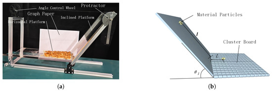 The static friction coefficient was determined using the inclined plane method [27]. The experimental setup is shown in Figure 4a, which consisted of an angle control wheel, protractor, inclined platform, and sheet of coordinate paper. The experiment involved placing the test surface on an inclined platform, positioning the material to be tested on the surface, and slowly adjusting the angle of inclination. A high-frame-rate camera was used to record the motion of the material, and the angle of the surface at which the material began to slide was measured. The experiment used diced chicken, peanuts, and diced scallions as the test materials, with PMMA, diced chicken cluster boards, peanut cluster boards, and diced scallion cluster boards as the test surfaces, as shown in Figure 5.