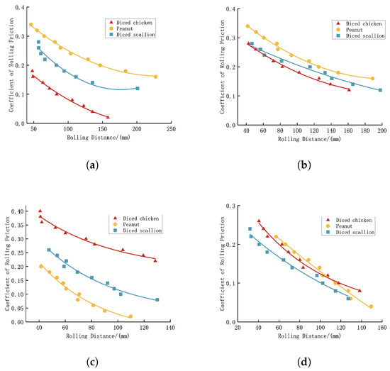 Fitting curves for different board rolling distances and coefficients of rolling friction: (a) PMMA board. (b) Diced chicken cluster board. (c) Peanut cluster board. (d) Diced scallion cluster board.