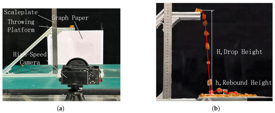 The rolling friction coefficient was determined using the rolling distance method [28]. The experimental setup shown in Figure 7 consisted of an angle control wheel, protractor, flat platform, inclined platform, and sheet of coordinate paper. The experiment involved placing the test surface on the flat platform, positioning the material to be tested on the inclined platform at a specified angle and distance, and recording the rolling process and distance of the material using a high-frame-rate camera. The rolling friction coefficient between the material and the surface was then calculated. Diced chicken, peanuts, and diced scallions were used as test materials, while PMMA, diced chicken cluster boards, peanut cluster boards, and diced scallion cluster boards were used as test surfaces.