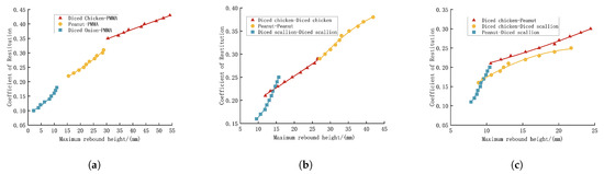When the sliding distances were set to 88.5 mm for diced chicken, 98.5 mm for peanuts, and 111.3 mm for diced scallions, the friction coefficients between the test materials and the diced chicken cluster board were calculated as 0.196 for diced chicken, 0.235 for peanuts, and 0.191 for diced scallions.