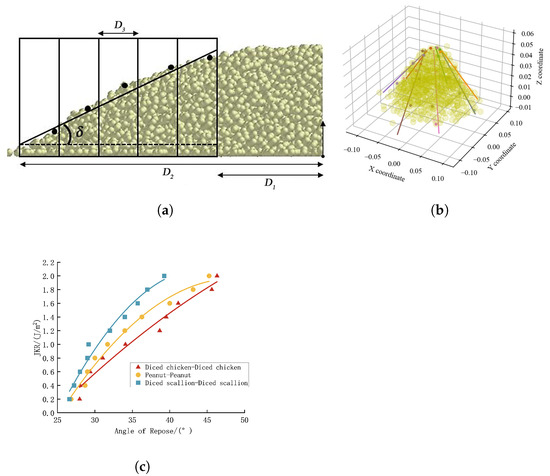 The DEM simulation for the angle of repose of the Kung Pao Chicken mixture is shown in Figure 14. Simulations with each set of data were repeated 10 times, and the average value was taken. The final simulation resulted in the smallest relative error of 0.05% compared with the actual measured angle of repose. These results demonstrated that the contact parameters of the Kung Pao Chicken mixture calibrated using this model were reliable.