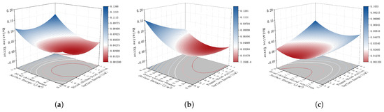 From Figure 13b, it can be seen that when the contact energy between the peanuts and diced scallions () was small, the relative error decreased as the contact energy between the diced chicken and peanuts () increased. The response surface was steep, with a large gradient.