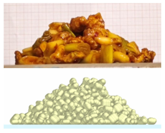 - The study demonstrates the feasibility of constructing accurate DEM models for viscous, multi-component Chinese dishes by combining physical experiments with stepwise simulation fitting. The final model showed excellent agreement with physical tests, with a relative error of only 0.05% in the angle of repose, confirming the reliability of the proposed calibration method.