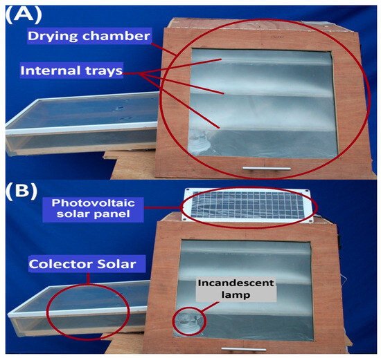 Design of the dehydrator for drying tostadas. (A) Solar dehydrator; (B) Hybrid dehydrator.