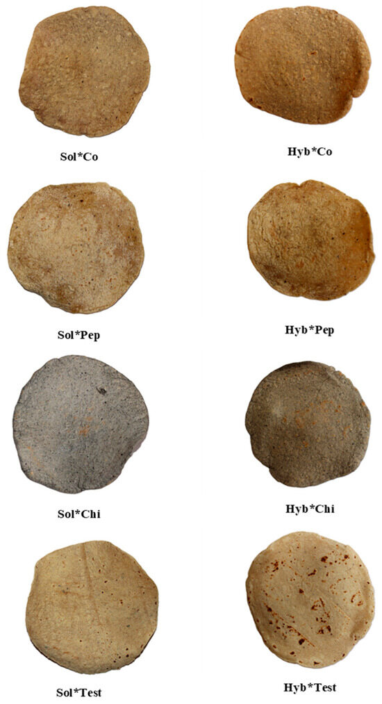 Images of tostadas evaluated using solar and hybrid methods. Hyb*Co = Hybrid dehydrated Cónico corn tostada; Hyb*Chi = Hybrid dehydrated Chiquito corn tostada; Hyb*Pep = Hybrid dehydrated Pepitilla corn tostada; Hyb*Test = Hybrid dehydrated commercial corn tostada; Sol*Co = Solar-dehydrated Cónico corn tostada; Sol*Chi = Solar-dehydrated Chiquito corn tostada; Sol*Pep = Solar-dehydrated Pepitilla corn tostada; Sol*Test = Solar-dehydrated commercial corn tostada.
