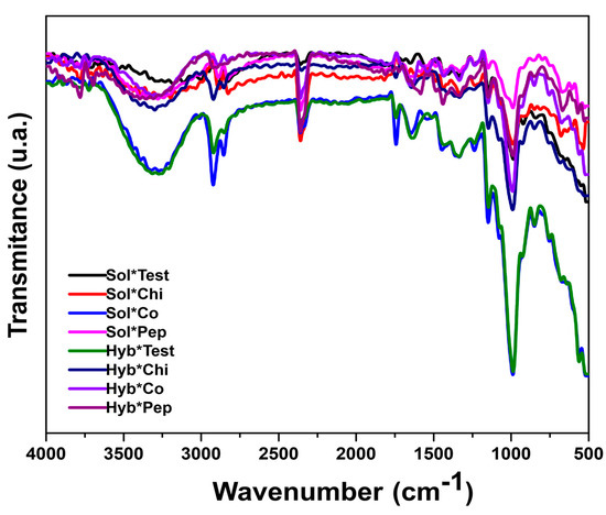 FTIR of tostadas samples. Hyb*Co = Hybrid dehydrated Cónico corn tostada; Hyb*Chi = Hybrid dehydrated Chiquito corn tostada; Hyb*Pep = Hybrid dehydrated pepitilla corn tostada; Hyb*Test = Hybrid dehydrated commercial corn tostada; Sol*Co = Solar-dehydrated Cónico corn tostada; Sol*Chi = Solar-dehydrated Chiquito corn tostada; Sol*Pep = Solar-dehydrated Pepitilla corn tostada; Sol*Test = Solar-dehydrated commercial corn tostada.